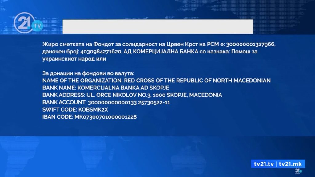 Жиро сметката на Фондот за солидарност на Црвен Крст на РСМ е: 300000001327966, даночен број: 4030984271620, АД КОМЕРЦИЈАЛНА БАНКА со назнака: Помош за украинскиот народ или