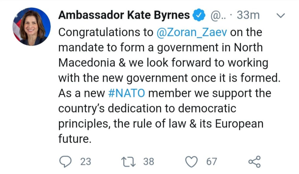 Американската амбасадорка во земјава, Кејт Мари Брнз денеска на лидерот на СДСМ, Зоран Заев му го честиташе мандатот за состав на нова влада, кој претходно му го додели претседателот на државата, Стево Пендаровски.