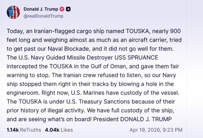 Бродот бил предупреден да застане во Оманскиот Залив и откако одбил, морнарицата го запрела со дупчење дупка во машинската просторија, напиша Трамп на својата мрежа Truth Social, велејќи дека „Туска“ е во американско „заробеништво“.