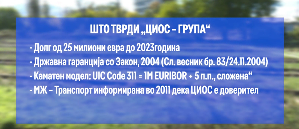Компанијата за присилна наплата „ЦИОС – група“ тврди дека „Македонски железници – Транспорт“ имаат долг кој од 3,85 милиони евра пораснал на повеќе од 25 милиони евра заклучно со крајот на 2023. Побарувањето, велат од ЦИОС, е гарантирано со државна гаранција врз основа на договорите во рамки на Меѓународната железничка унија од 2004 година. „ЦИОС“ за долгот бара вонсудско порамнување.