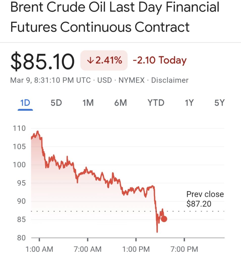 Графиконот од последното деноноќие покажува уште поизразен пад ако се земе предвид нивото од претходната ноќ. Според движењето на пазарот, цената на нафтата од речиси 110 долари за барел, колку што изнесувала околу полноќ, постепено се намалувала во текот на денот, за попладнево да падне и под границата од 85 долари.