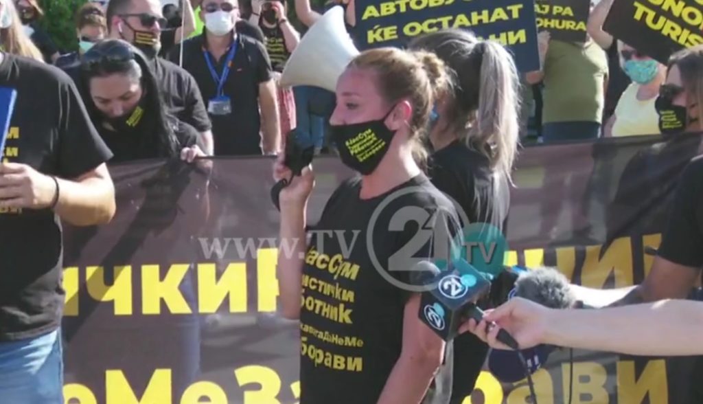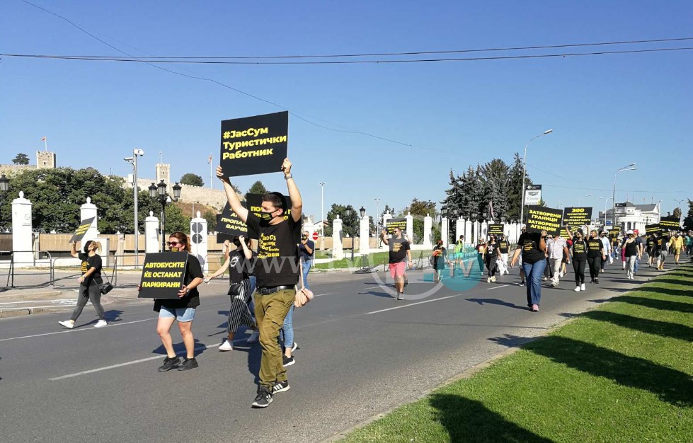 „Туризмот на респиратор“,„Ни треба помош сега и веднаш“, „Триста туристички агенции ќе стават клуч на врата“, „Државата ќе загуби милионски суми од даноци“, „Автобусите ќе останат паркирани“, „Помош за агенциите значи спас за туризмот“, беа само дел од транспарентите на денешниот мирен протест што го организираа туристичките работници.