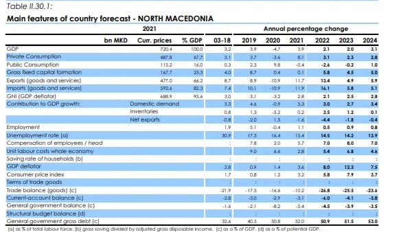 Во пролетната економска прогноза на ЕК, во делот за Северна Македонија, се вели дека по делумното закрепнување од рецесијата предизвикана од пандемијата од Ковид-19, годишниот раст на БДП забави од 3,9 проценти во 2021 година на 2,1 процент во 2022 година. На економијата на земјата влијаеја намалената надворешната побарувачка, прекините во глобалните синџири на снабдување и растот на глобалните цени на храната и енергијата.