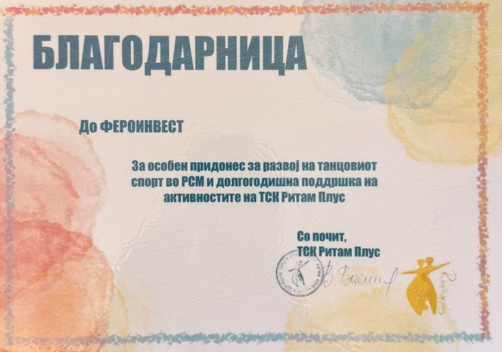 ФЕРОИНВЕСТ беше спонзор на престижниот интернационален натпревар во латиноамерикански и стандардни танци, кој викендов се одржа во Скопје под покровителство на Светската федерација за спортски танц (World DanceSport Federation – WDSF).