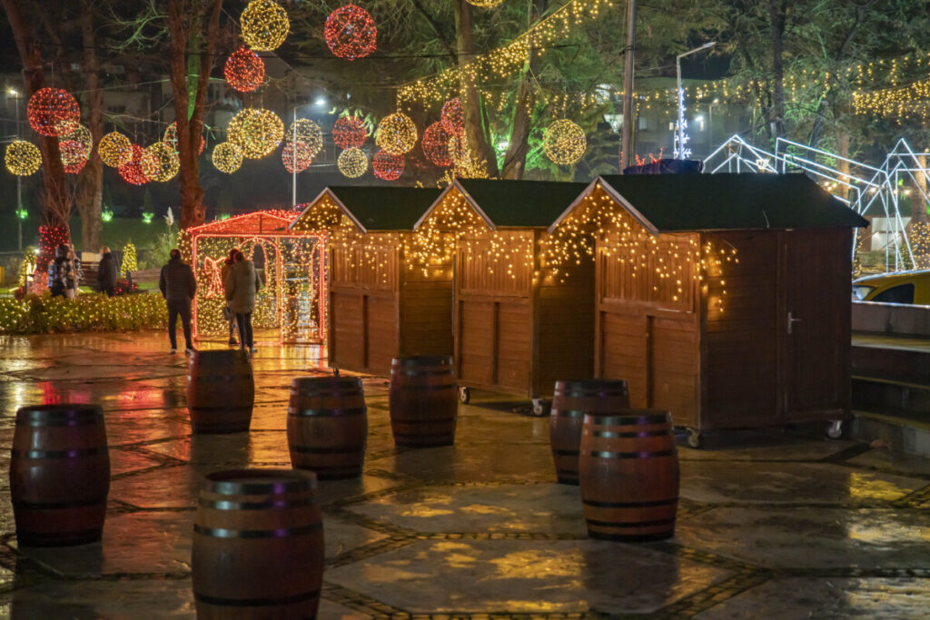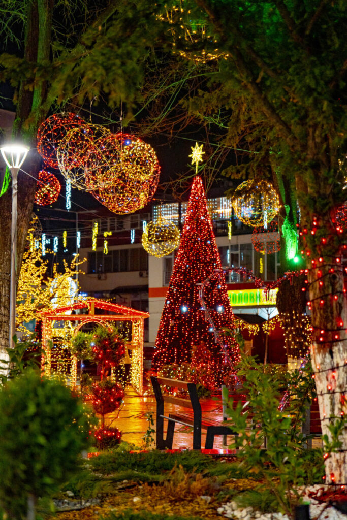 Централното место го зазема раскошната новогодишна елка, опкружена со уникатни светлечки атракции како илуминација 2026, светлечки тунели, дрвени куќички и украсени дрвја.