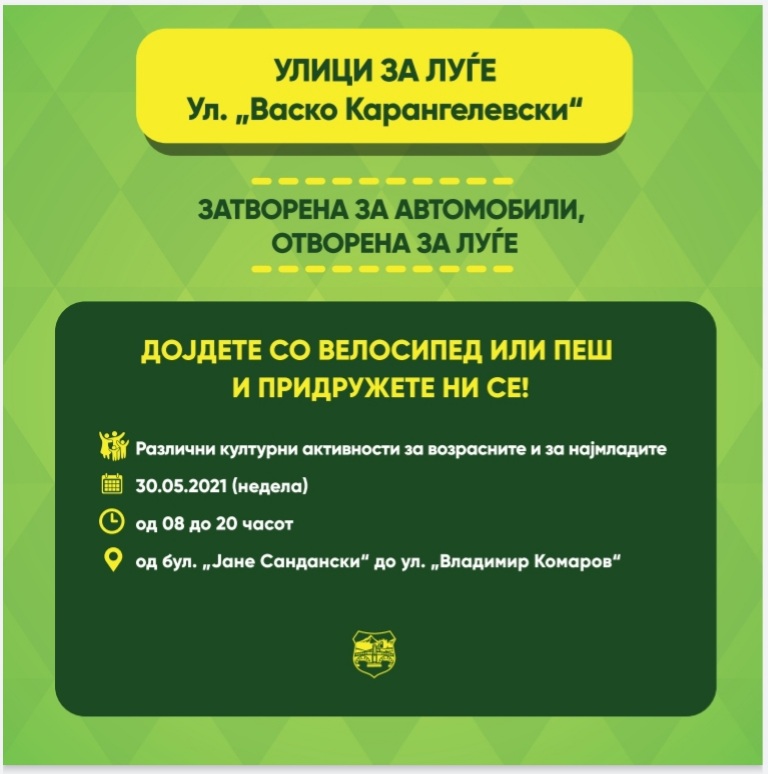 Во недела, на 30.05.2021 година, Градот Скопје ќе организира Ден без автомобили под мотото „Улици за луѓе“. За таа цел, улицата Васко Карангелевски во Аеродром ќе биде затворена за автомобилски сообраќај вкупно 12 часа, во периодот од 8 до 20 часот. На потегот од булеварот Јане Сандански до крстосницата со улицата Владимир Комаров ќе се случуваат различни културни активности за возрасните, но и за најмладите.