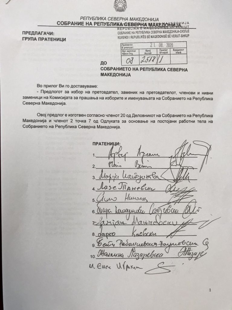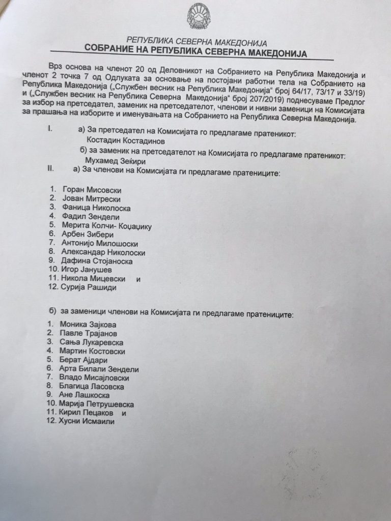Со 90 гласа ЗА, 2 против и 2 воздржани, избрани се претседател, заменик претседател, членови и нивни заменици на Комисијата за прашања на изборите и именувањата на Собранието, по иницијатива на 11 пратеници.