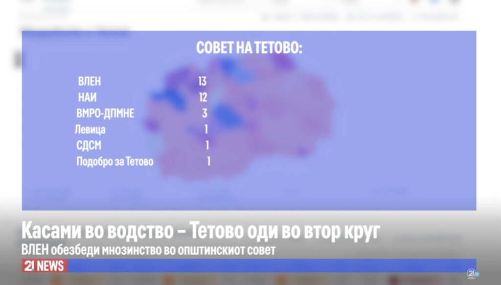Во општинскиот совет на Тетово, ВЛЕН ќе има 13 советници, потоа следуваат, НАИ со 12, ВМРО-ДПМНЕ – 3, Левица – 1, СДСМ – 1 и Подобро за Тетово 1.