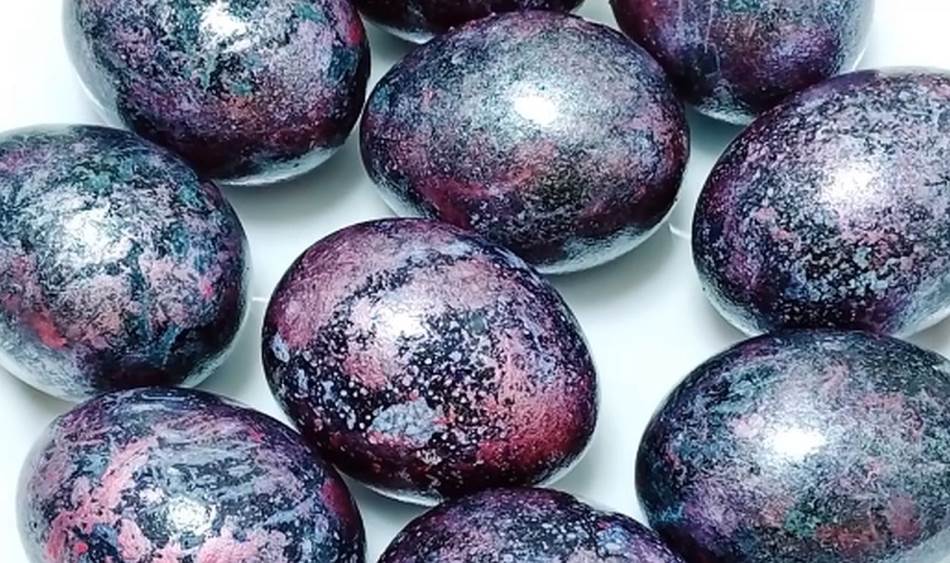 Двете бои совршено ќе се спојат и ќе добиете прекрасен дезен кој можеме да го наречеме „космички“ јајца. Кога јајцата целосно ќе се исушат, премачкајте ги со масло да блеснат.
