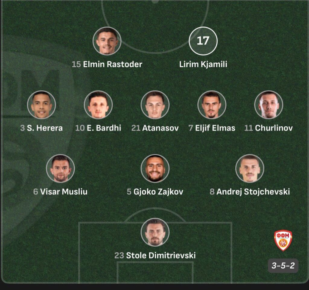 Македонија против Данска ќе настапи со формација 3-5-2, со избалансиран пристап кој има за цел сигурност во одбраната и брзи излегувања во напад. Во првата линија, главната одговорност им се доверува на двојката Лирим Ќамили и Елмин Растодер, при што Ќамили добро го познава данскиот фудбал бидејќи настапува во оваа лига.