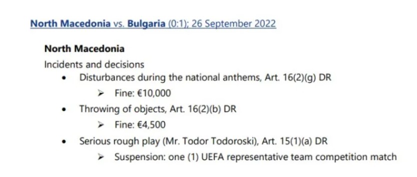 Македонија сега треба да плати вкупно 14.500 евра, од кои 10.000 за исвиркувањето при интонирање на бугарската химна и 4.500 за фрлање предмети на теренот во арената „Тоше Проески“.