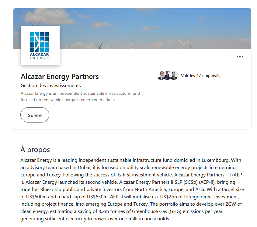 За поддршка на проектот, зад инвестицијата стои „Алказар енерџи“, одржлив инфраструктурен фонд базиран во Луксембург, со советодавен тим во Дубаи. Фондот, чие раководство го спроведува соосновачот Даниел Калдерон, е специјализиран за проекти со обновлива енергија на развојните пазари во Европа и Турција.