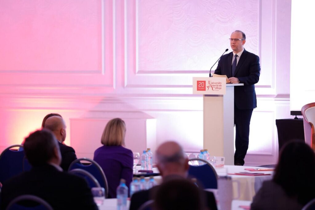 Осврнувајќи се на достигнувањата на УАКС како лидер во високото образование во земјата, претседателот на Собранието Гаши посочи: „Изминатите две децении, Универзитетот Американ Колеџ Скопје беше пионер во усвојувањето и употребата на меѓународните стандарди за квалитет во високото образование, градејќи добри образовни мостови помеѓу американскиот и европскиот пристап кон образованието. Ова овозможи напредна филозофија на учење што не се заснова на квантитет, туку на квалитет, на критичко размислување, креативност и интегритет. УАКС останува пример за визија, партнерство и вредности што треба да се негуваат и во следните 20 години.” – потенцираше претседателот на Собранието Гаши.