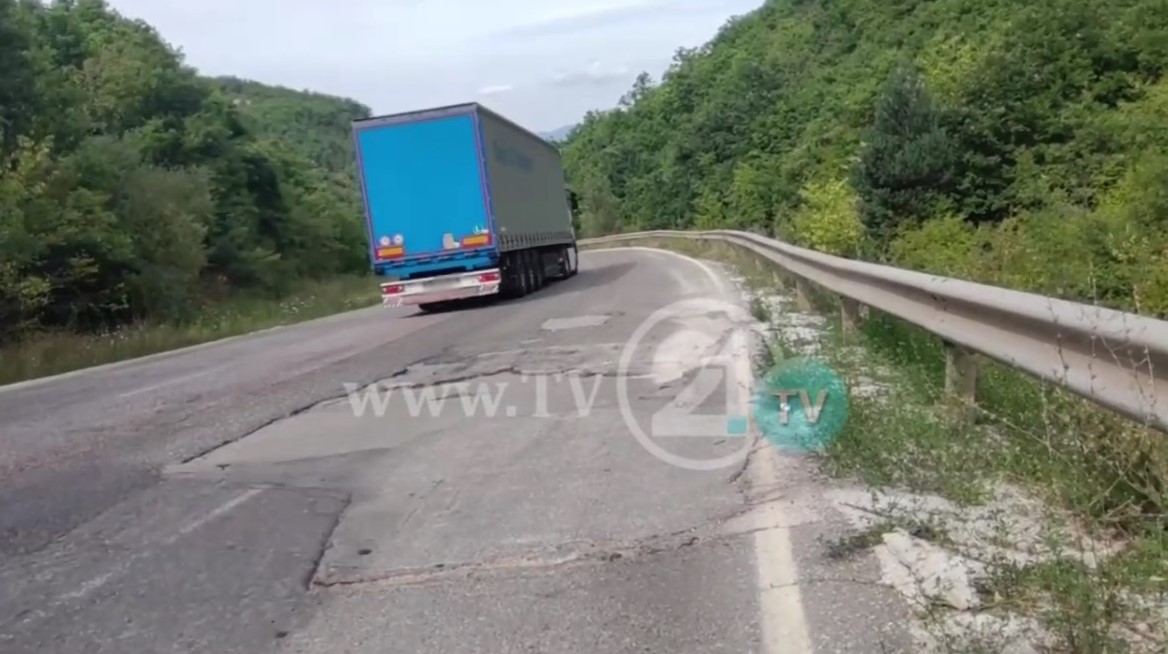 „Се наоѓаме на автопатот кој го поврзува Струга со Ќафасан. Овој пат веќе неколку децении е уништен и со големи дупки, затоа автомобилите се приморани да излезат на другата насока за да ги избегнат. Некои од нив, како што е оваа пред мене, се многу тешки за поминување. Имаше разни ветувања од властите, но без одреден рок кога овој пат ќе биде саниран“, посочува репортерката на ТВ21.