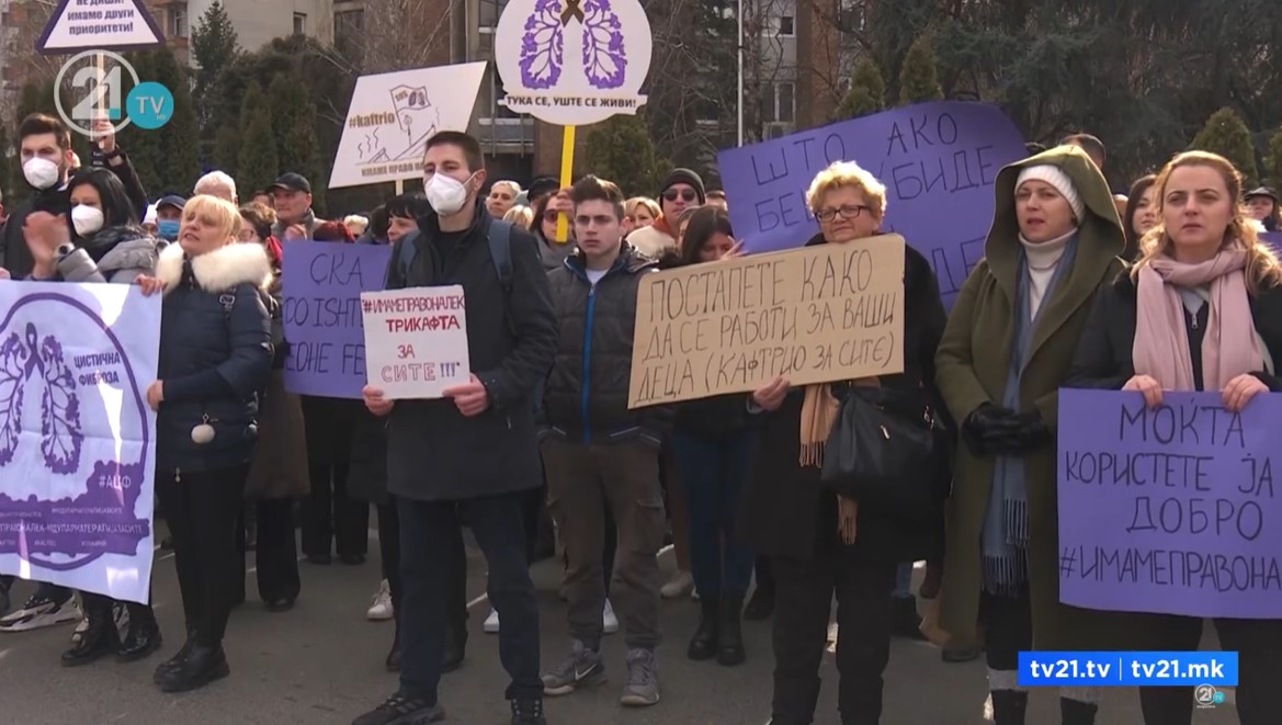 Пациентите со цистична фиброза денеска повторно излегоа на протест пред Владата, со апел државата да им го обезбеди потребниот лек, за да можат да живеат нормално. Иако вчера министерот за здравство, Беким Сали рече дека ќе почнат процедура за набавка на лекот, овие пациенти бараат ветувањата да бидат испишани и на хартија.