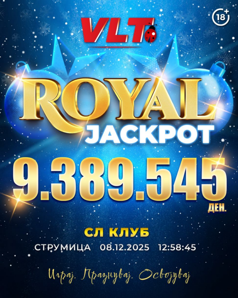 РОЈАЛ ЏЕКПОТ добивката вредна фантастични 9.389.545 денари е освоена во Спортлајф Гејминг во Струмица на 08.12.2025. Среќната ВЛТ игра е 40 Брнинг хот.