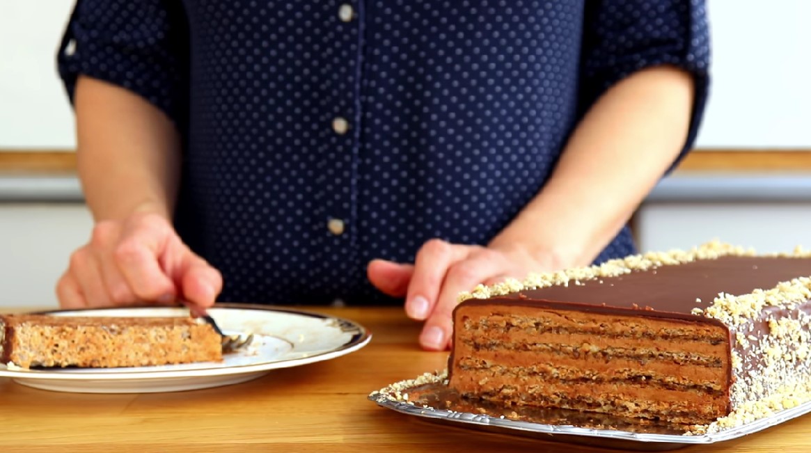 Потоа двете кори исечете ги на 2 дела. Покријте ги сите кори со крпа додека го правите филот. Изматете ги жолчките со шеќер и потоа изматете ги на пареа со мешање. Додадете го чоколадото и мешајте додека не се растопи. Извадете го филот од шпоретот и покријте го со проѕирна фолија. Кога ќе се излади на собна температура додадете го путерот кој исто така е на истата температура и убаво изматете го. Наредете ја кората, филот и така додека не ја потрошите. Последниот ред нека биде филот и по желба посипете со мелени ореви.