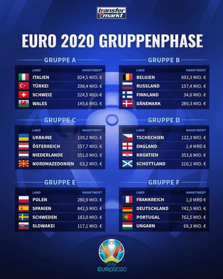 Најскапа селекција на ЕВРО 2021 година ќе биде Англија со 1,4 милијарди. Втора е Франција со 1 милијарда, а Шпанија трета со 842 милиони евра.