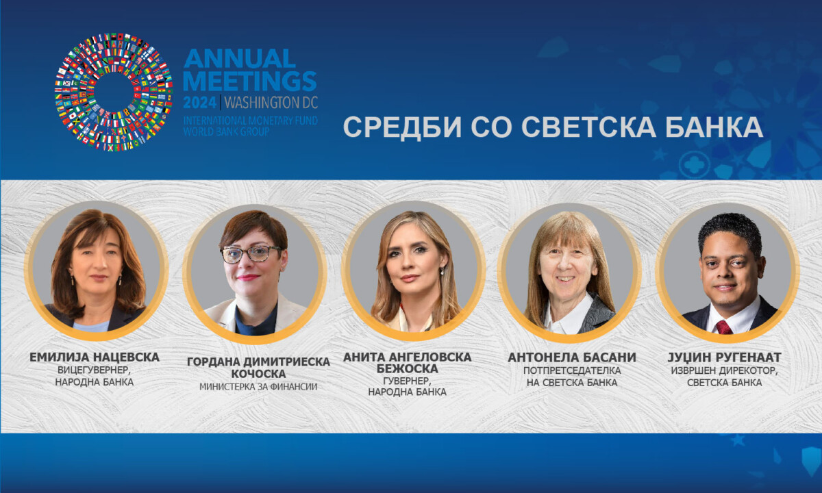 Макропрудентната политика на Народната банка придонесе за дополнително зајакнување на отпорноста на банкарскиот сектор во изминатите неколку години на постојани кризи. Соодветната комбинација на мерки и политики овозможи повеќе показатели за здравоста на банкарскиот систем тековно да се подобри и во однос на предкризните нивоа. Ова беше посочено на состаноците на гувернерката на Народната банка, Анита Ангеловска-Бежоска и вицегувернерката Емилија Нацевска, со високи претставници на Светската банка, потпретседателката Антонела Басани, извршниот директор на Конституенцата на која ѝ припаѓаме, Јуџин Ругенаат, како и тимот на Светската банка за платните системи, за време на Годишните средби на Меѓународниот монетарен фонд и Светската банка, кои се одржуваат во Вашингтон, САД. Средбите беа одржани заедно со министерката за финансии Гордана Димитриеска-Кочоска и нејзиниот тим.