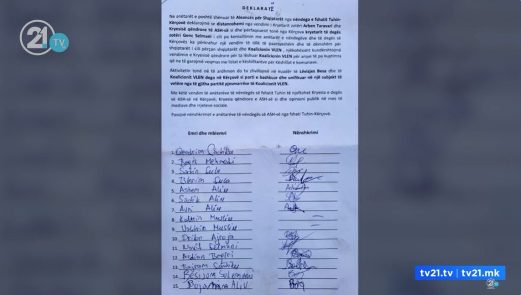 Во меѓувреме, на локалните избори АА на Арбен Таравари ќе се натпреварува со посебна листа за општински советници. Неодамна членовите на подогранокот на АА од кичевското село Тухин преку соопштение истакнаа дека се оградуваат од неодамнешните потези на партијата, како во однос на советничката листа, така и во однос на нејзиното излегување од коалицијата ВРЕДИ.