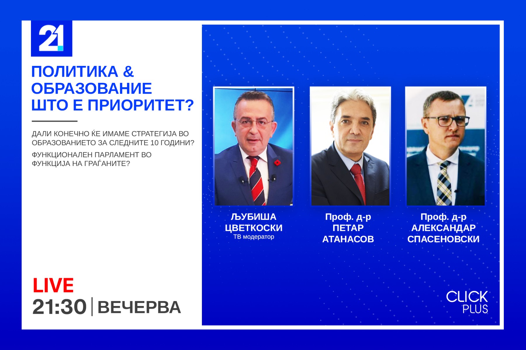 Вечерва во дебатниот магазин „ClickPlus“ на ТВ21 со Љубиша Цветкоски ќе дебатираме за:
