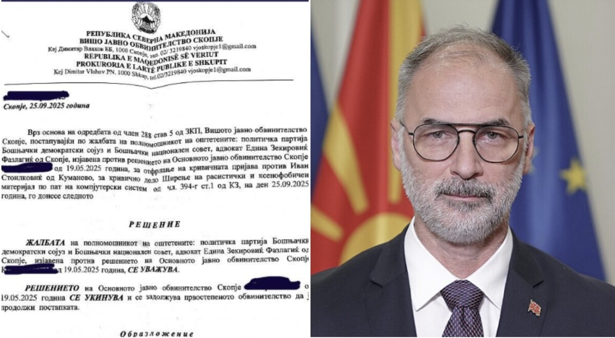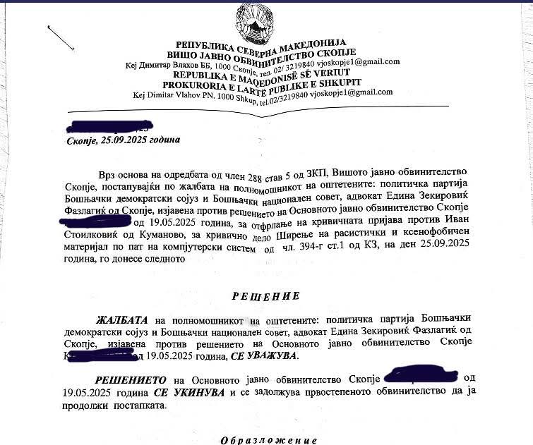 Вишото јавно обвинителство донесе решение со кое ја уважи жалбата на Бошњачкиот демократски сојуз (БДС) и Бошњачкиот национален совет (БНС) во Република Северна Македонија, против решението на Основното јавно обвинителство Скопје од 19 мај 2025 година.