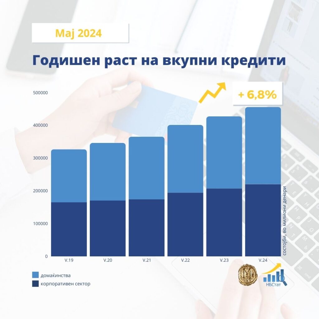 На годишна основа, вкупните кредити бележат раст од 6,8%, како резултат на зголеменото кредитирање на двата сектора, коешто е поизразено кај секторот домаќинства“, стои во соопштението на Народна банка.