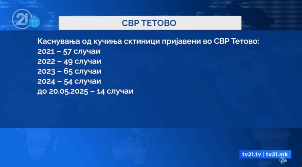 Според податоците на СВР Тетово, во 2024 година вкупно 54 граѓани пријавиле каснување од улични кучиња, додека во 2023 година се регистрирани 65 такви случаи.