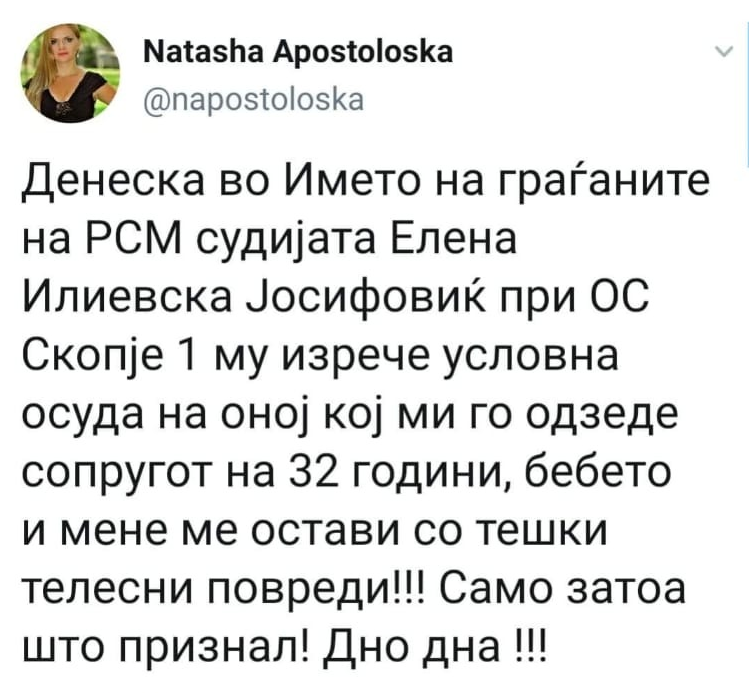 Статус на социјалните мрежи објави и сопругата на загинатото лице, Наташа Апостолоска која посочува дека човекот кој, и го одзел сопругот и детето, а неа ја оставил со повреди, бил осуден само условно затоа што ја признал вината.