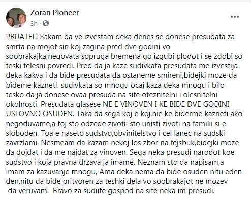 Родителот на лицето кое што загина во сообраќајката, на својот Фејсбук профил напиша статус во кој вели дека за виновникот за смртта на неговиот син денес била донесена пресуда дека не е виновен, туку само бил условно осуден на две години.