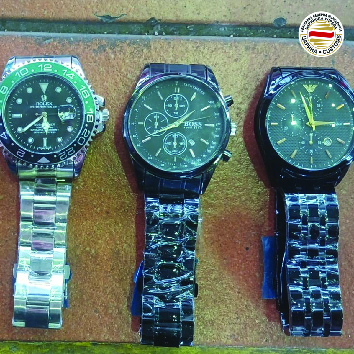 Дури 1.158 парчиња часовници со потпис на заштитени трговски марки „Ролекс“, „Бос“, „Армани“ и „Томи Хилфигер“ се запленети при контрола на стока пријавена за транзит на граничен премин Богородица. Случајот е откриен од мобилен царински тим, кој поради сомневање изврши детален преглед, при што се пронајдени часовници чија пријавена вредност согласно фактура издадена од фирма од Кина изнесува 60.852 денари. Поради основано сомневање за повреда на право од интелектуална сопственост, стоката е задржана, при што е започната постапка за утврдување на оригиналноста на производите.